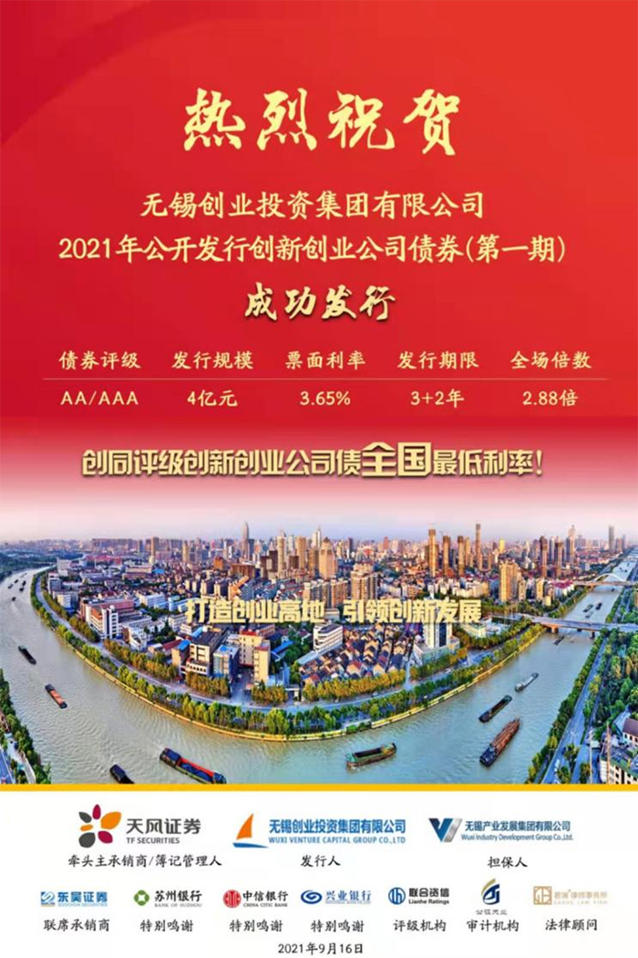 9月16日,無錫創(chuàng)業(yè)投資集團有限公司(以下簡稱“無錫創(chuàng)投集團”)2021年公開發(fā)行創(chuàng)新創(chuàng)業(yè)公司債券(第一期)成功發(fā)行,發(fā)行規(guī)模4億元。